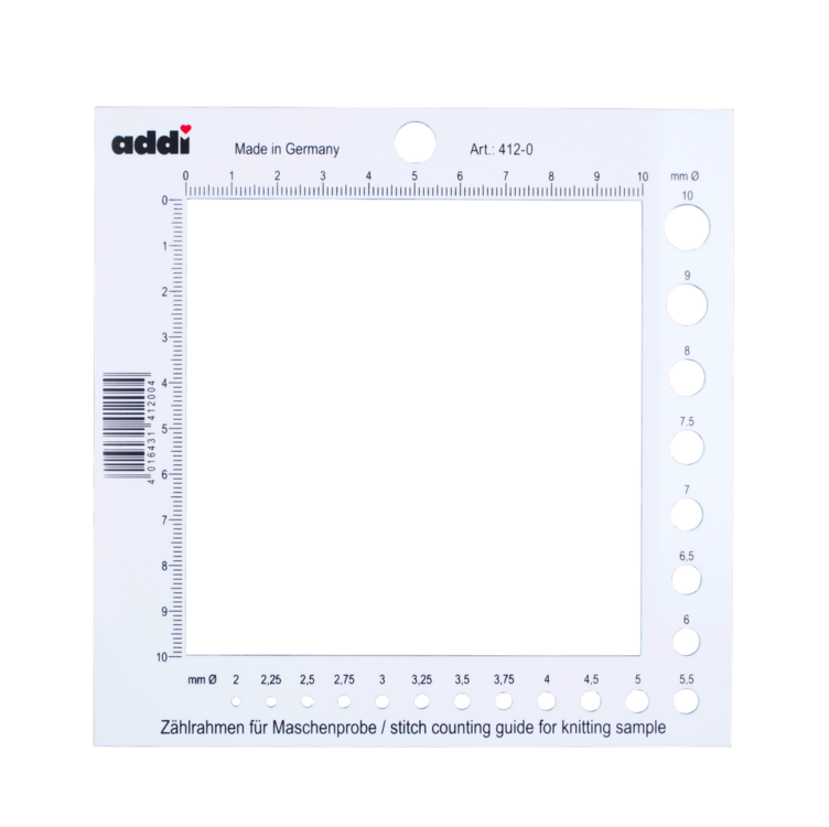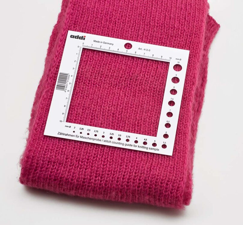 addi Square Counting Frame je nevyhnutný pomocník pri každom pletení, najmä pri príprave skúšobnej vzorky. Tento veľký merací rámček vám umožní rýchlo a presne zistiť: